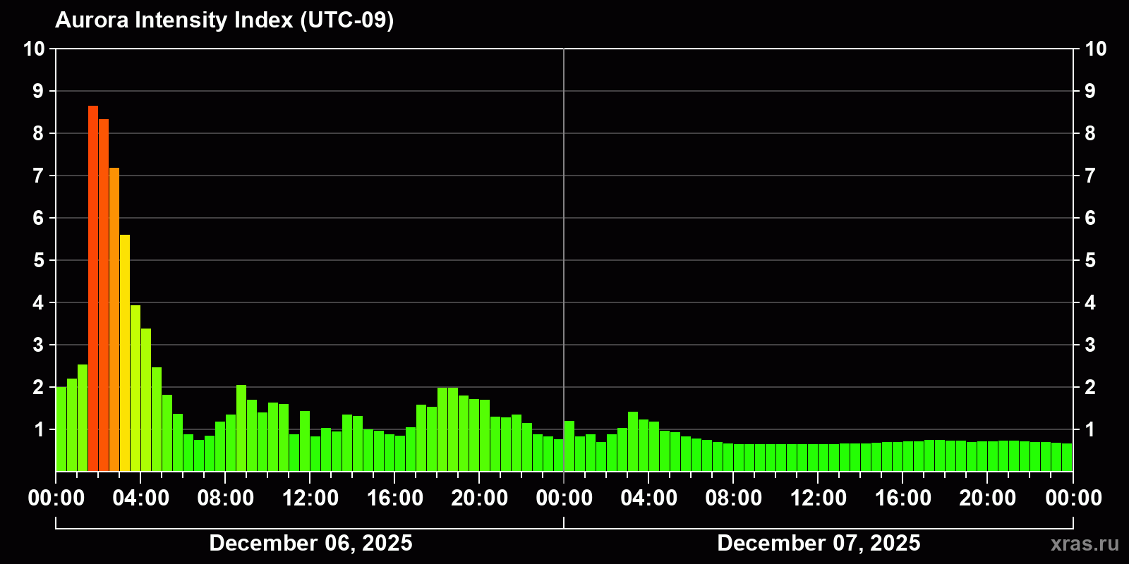 Changes in the auroral intensity index from 2025-12-06 to 2025-12-07 local time