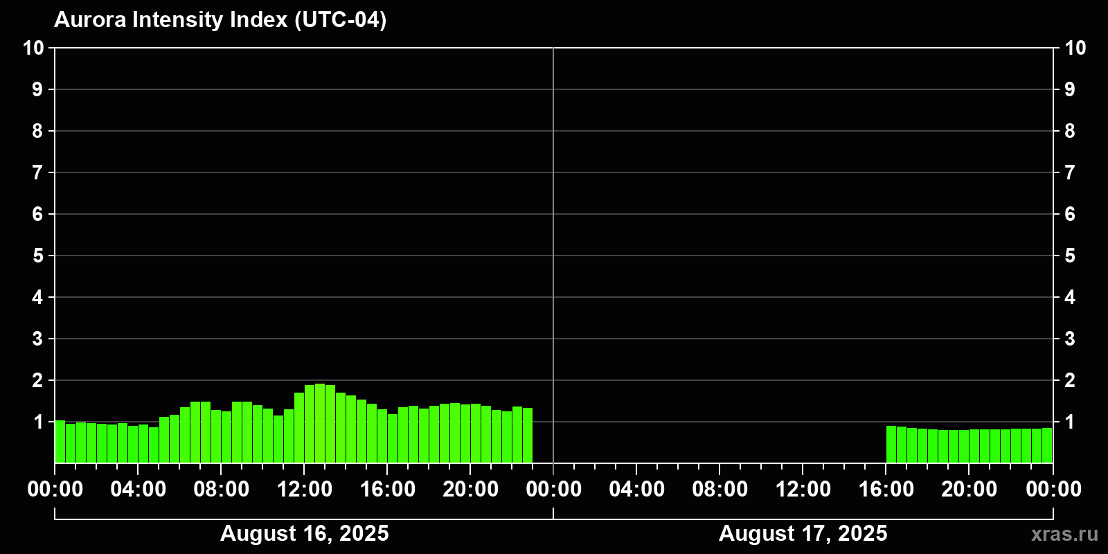 Changes in the auroral intensity index from 2025-08-16 to 2025-08-17 local time