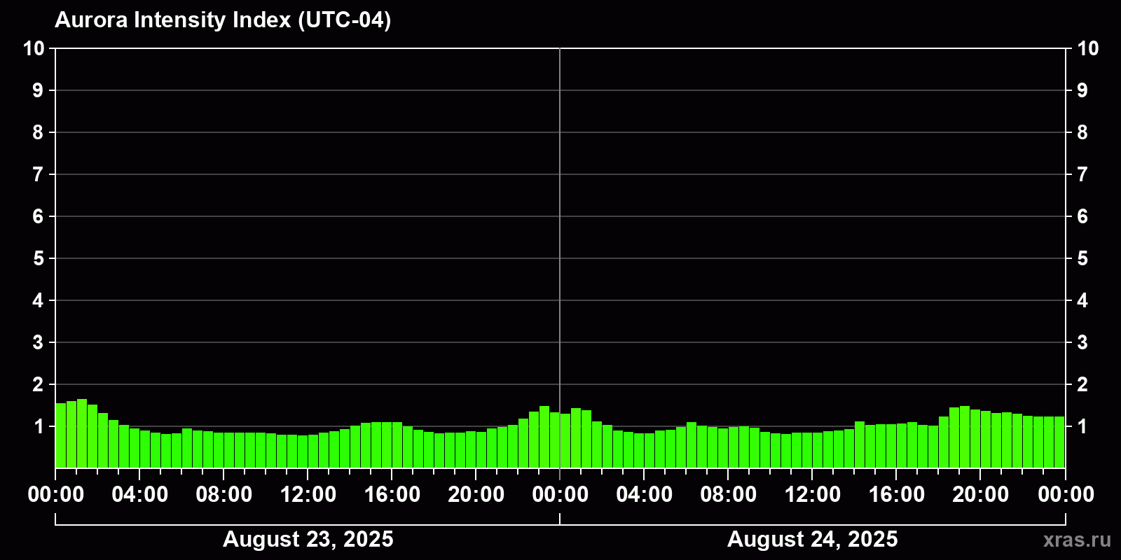 Auroral intensity index and the theoretically possible latitude of observations for nighttime in the Western Hemisphere as of 2025-08-24 23:50 (end of day) local time