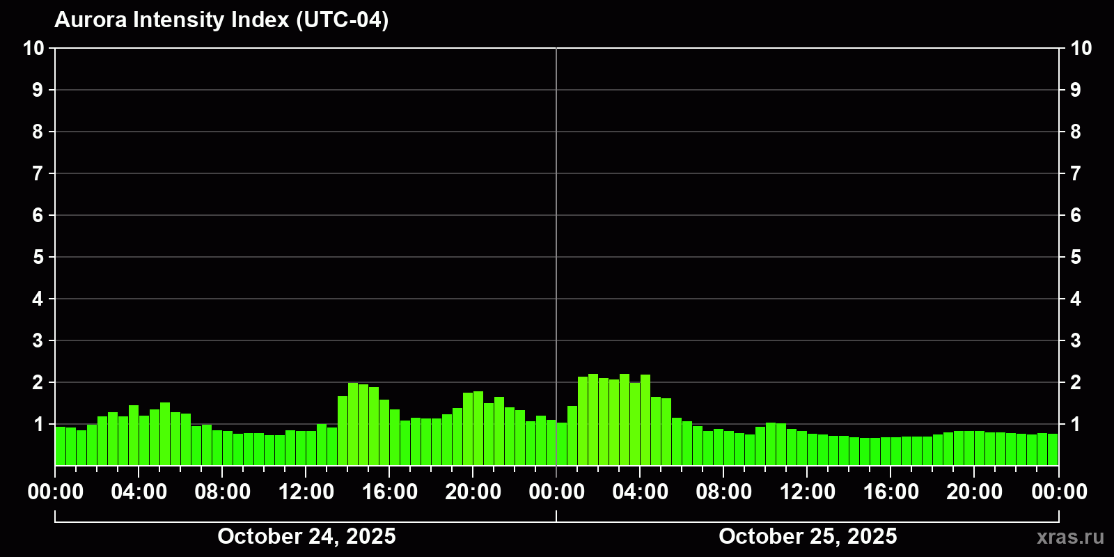 Auroral intensity index and the theoretically possible latitude of observations for nighttime in the Western Hemisphere as of 2025-10-25 23:53 (end of day) local time