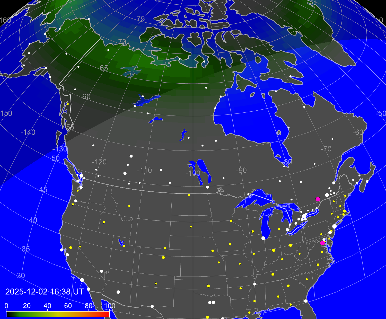 Изменения и часовой прогноз индекса интенсивности полярных сияний с 2025-11-30 по 2025-12-01
