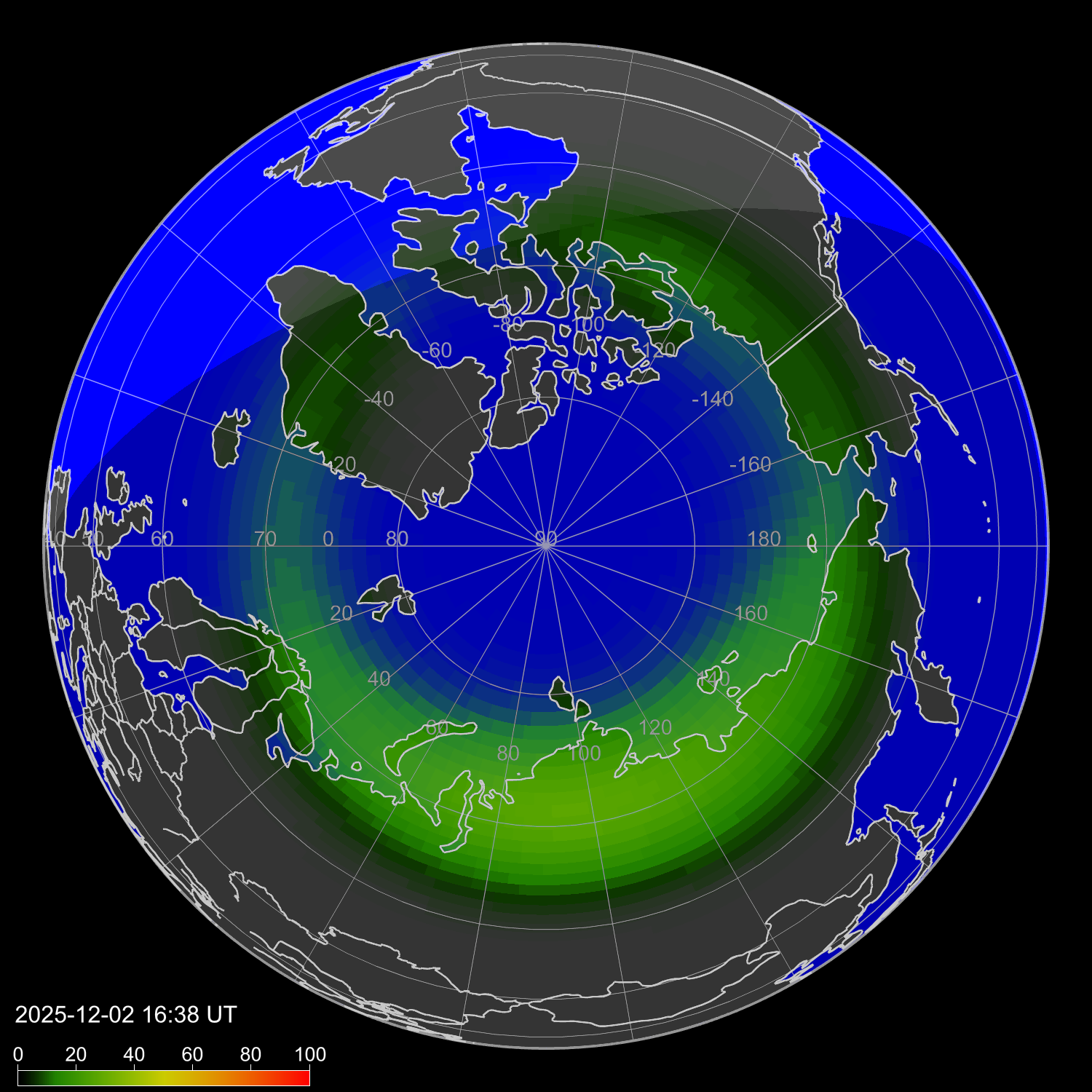 Индекс интенсивности полярных сияний и теоретически возможная широта наблюдений для ночного времени в западном полушарии