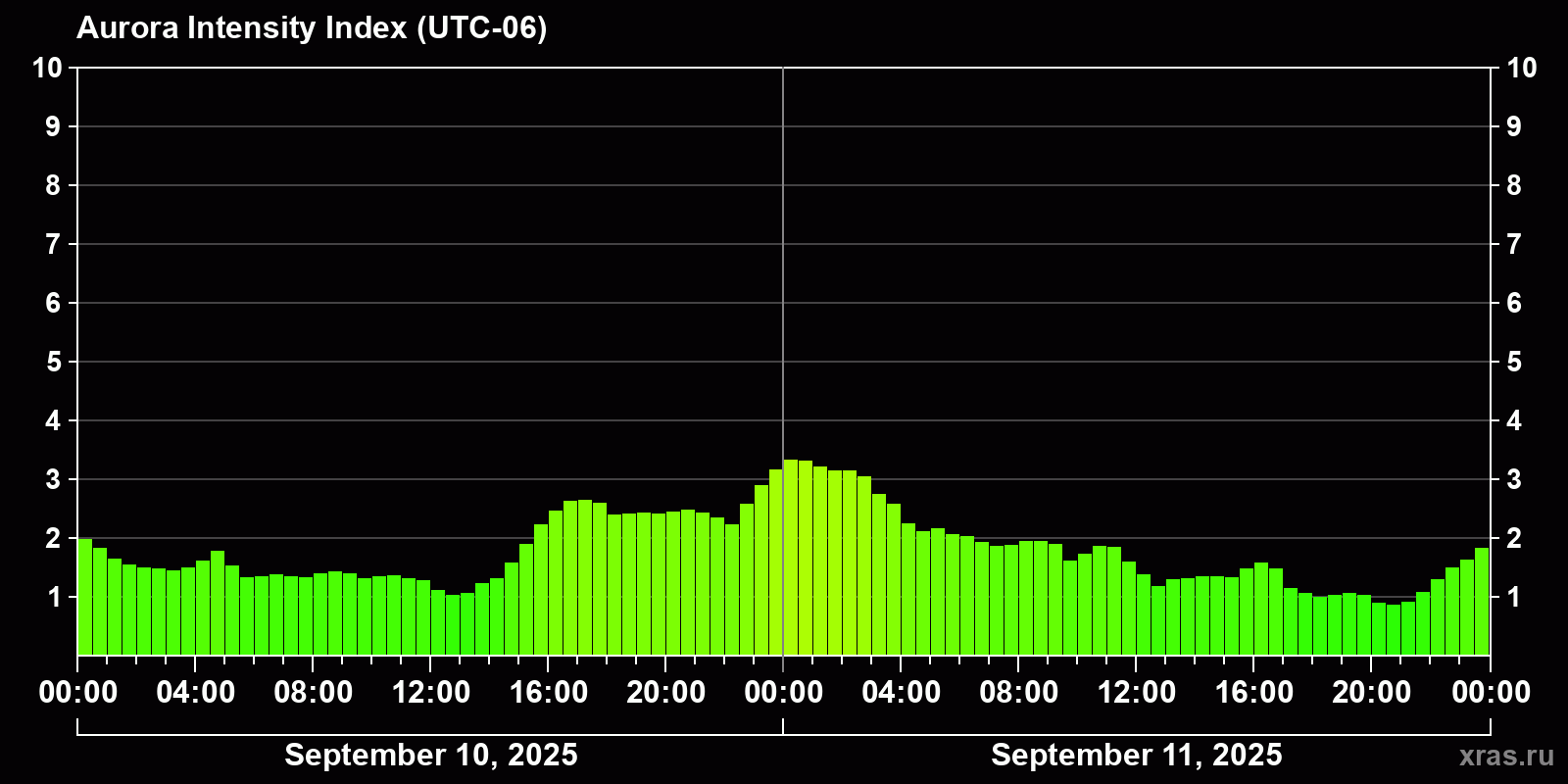 Auroral intensity index and the theoretically possible latitude of observations for nighttime in the Western Hemisphere as of 2025-09-11 23:47 (end of day) local time