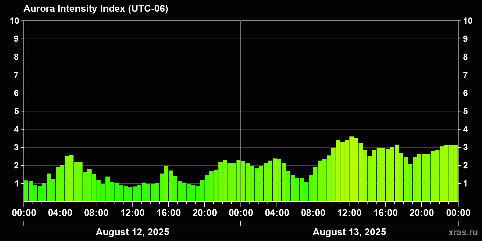 Changes in the auroral intensity index from 2025-08-12 to 2025-08-13 local time
