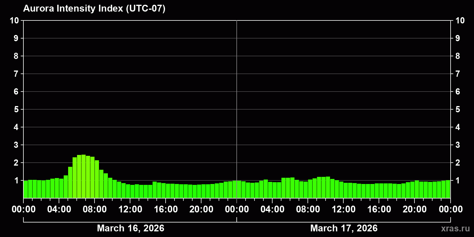 Changes in the auroral intensity index from 2026-03-16 to 2026-03-17 local time