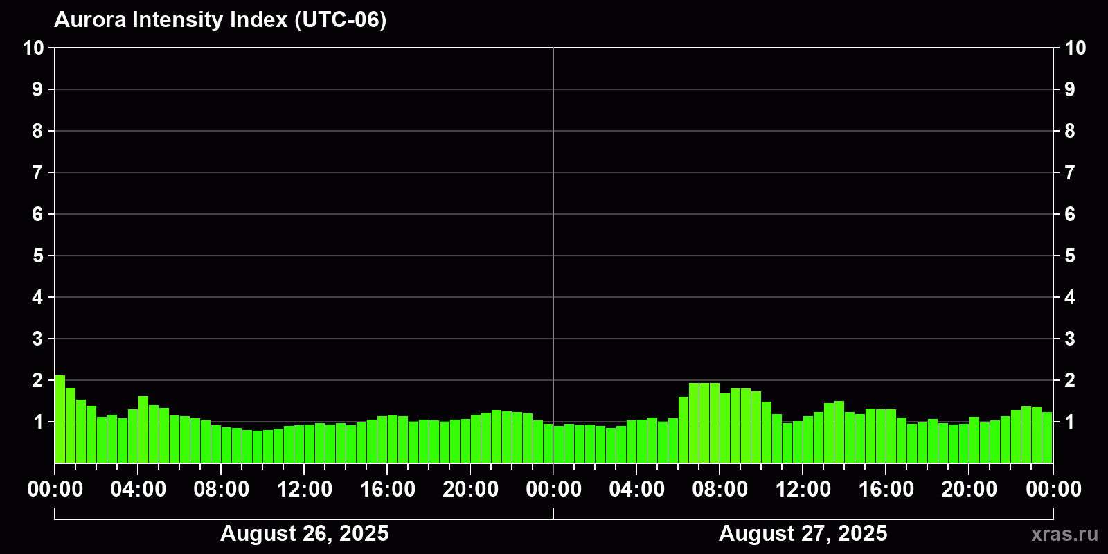 Changes in the auroral intensity index from 2025-08-26 to 2025-08-27 local time