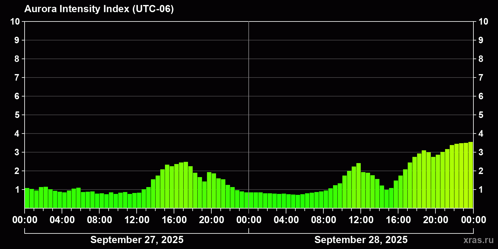 Auroral intensity index and the theoretically possible latitude of observations for nighttime in the Western Hemisphere as of 2025-09-28 23:58 (end of day) local time