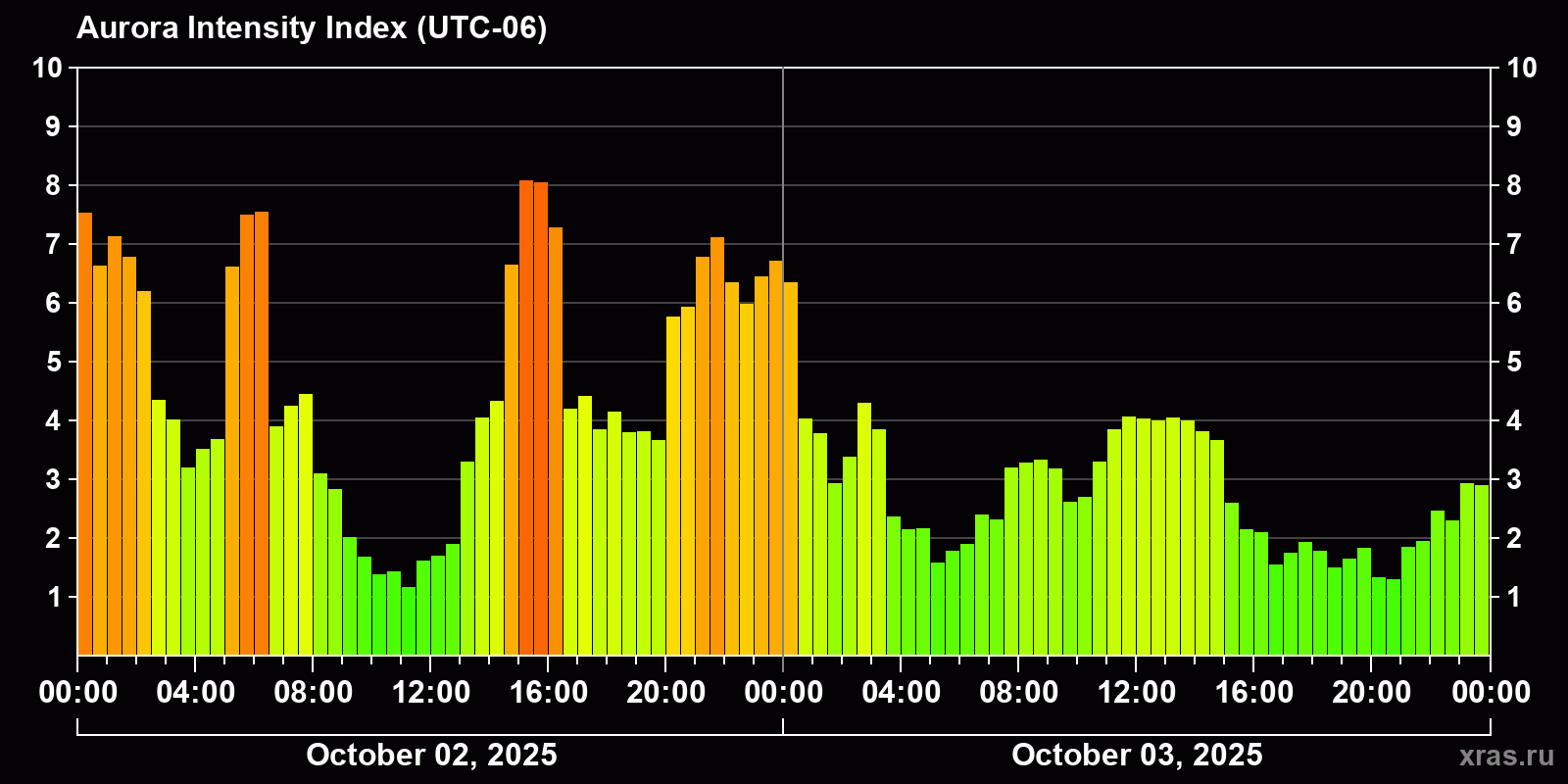 Changes in the auroral intensity index from 2025-10-02 to 2025-10-03 local time