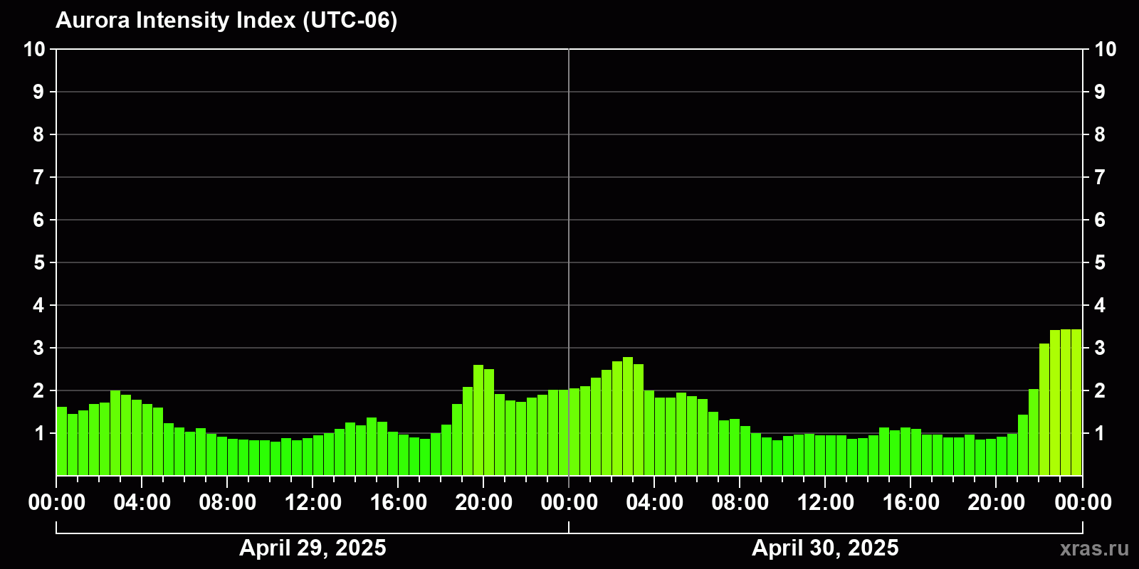 Auroral intensity index and the theoretically possible latitude of observations for nighttime in the Western Hemisphere as of 2025-04-30 23:54 (end of day) local time