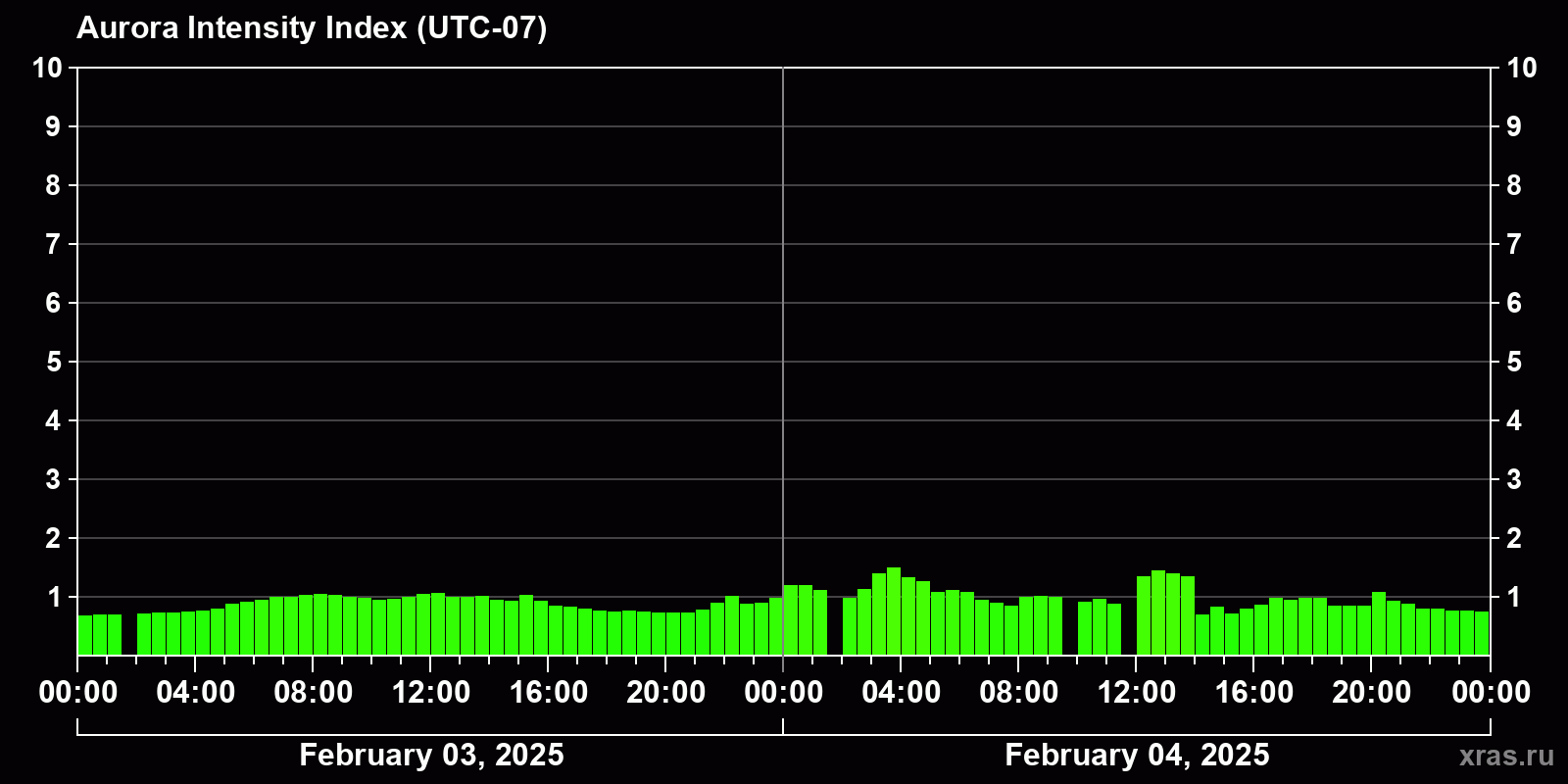 Changes in the auroral intensity index from 2025-02-03 to 2025-02-04 local time