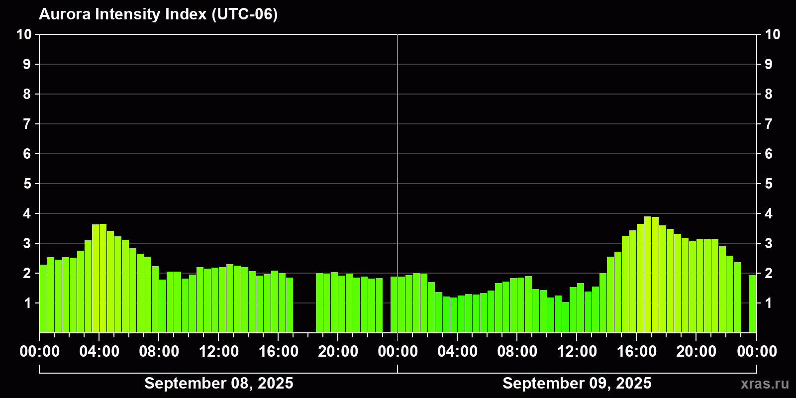Auroral intensity index and the theoretically possible latitude of observations for nighttime in the Western Hemisphere as of 2025-09-09 23:58 (end of day) local time
