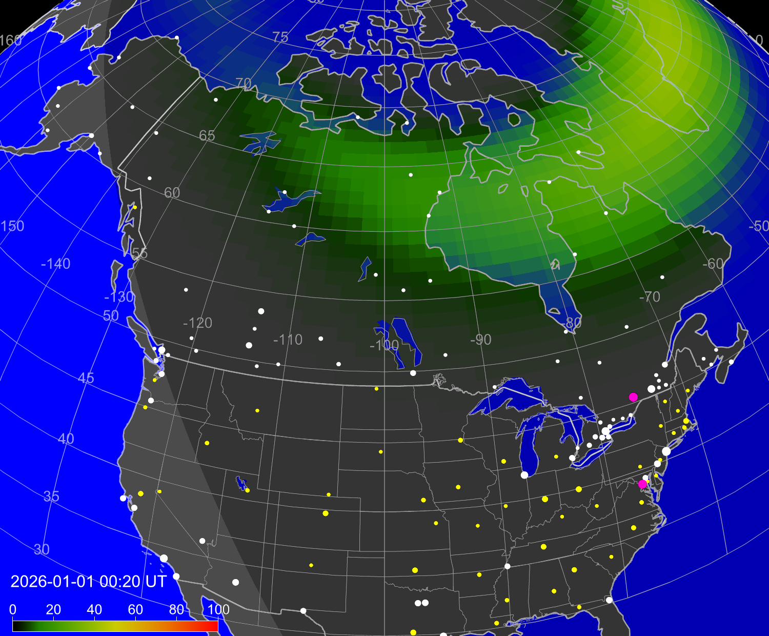 Вероятность полярных сияний в городах США