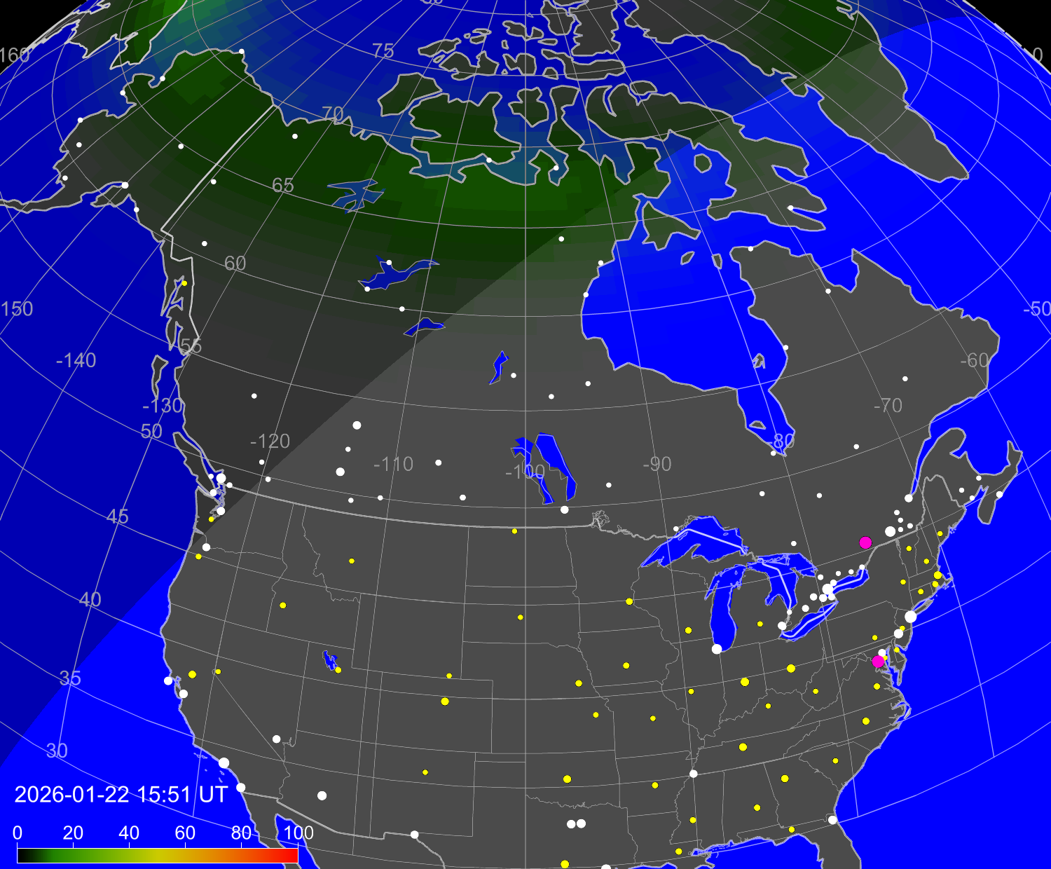 Индекс интенсивности полярных сияний и теоретически возможная широта наблюдений для ночного времени в западном полушарии
