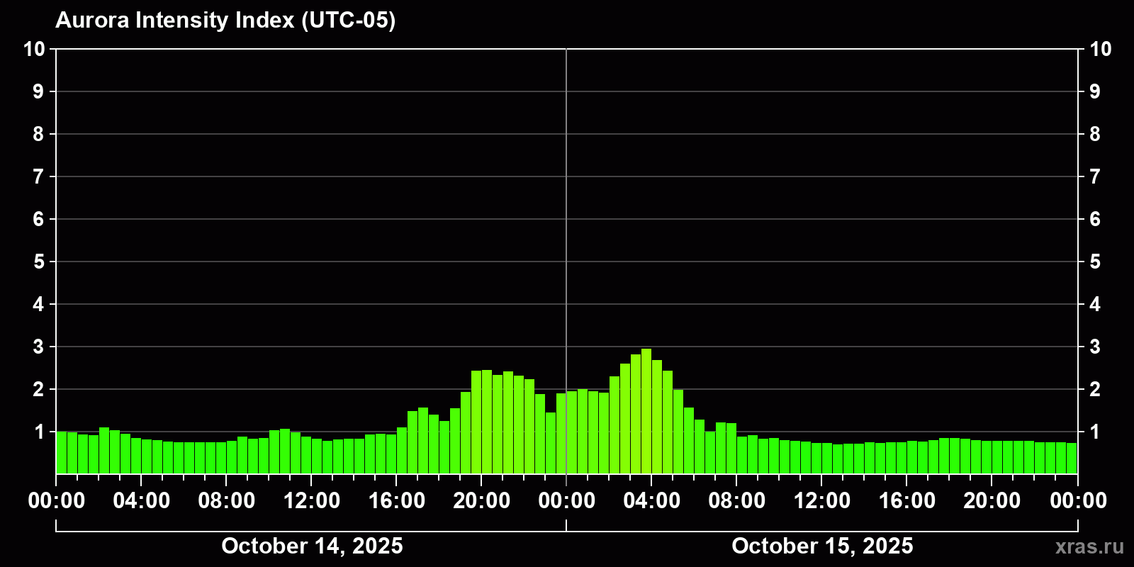 Auroral intensity index and the theoretically possible latitude of observations for nighttime in the Western Hemisphere as of 2025-10-15 23:53 (end of day) local time
