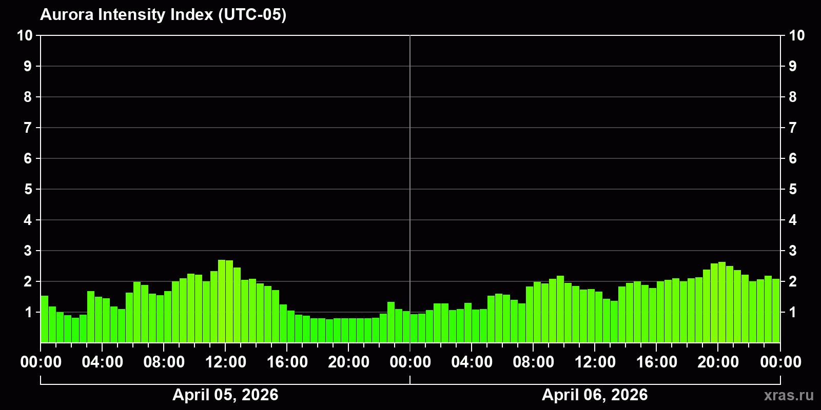 Changes in the auroral intensity index from 2026-04-05 to 2026-04-06 local time