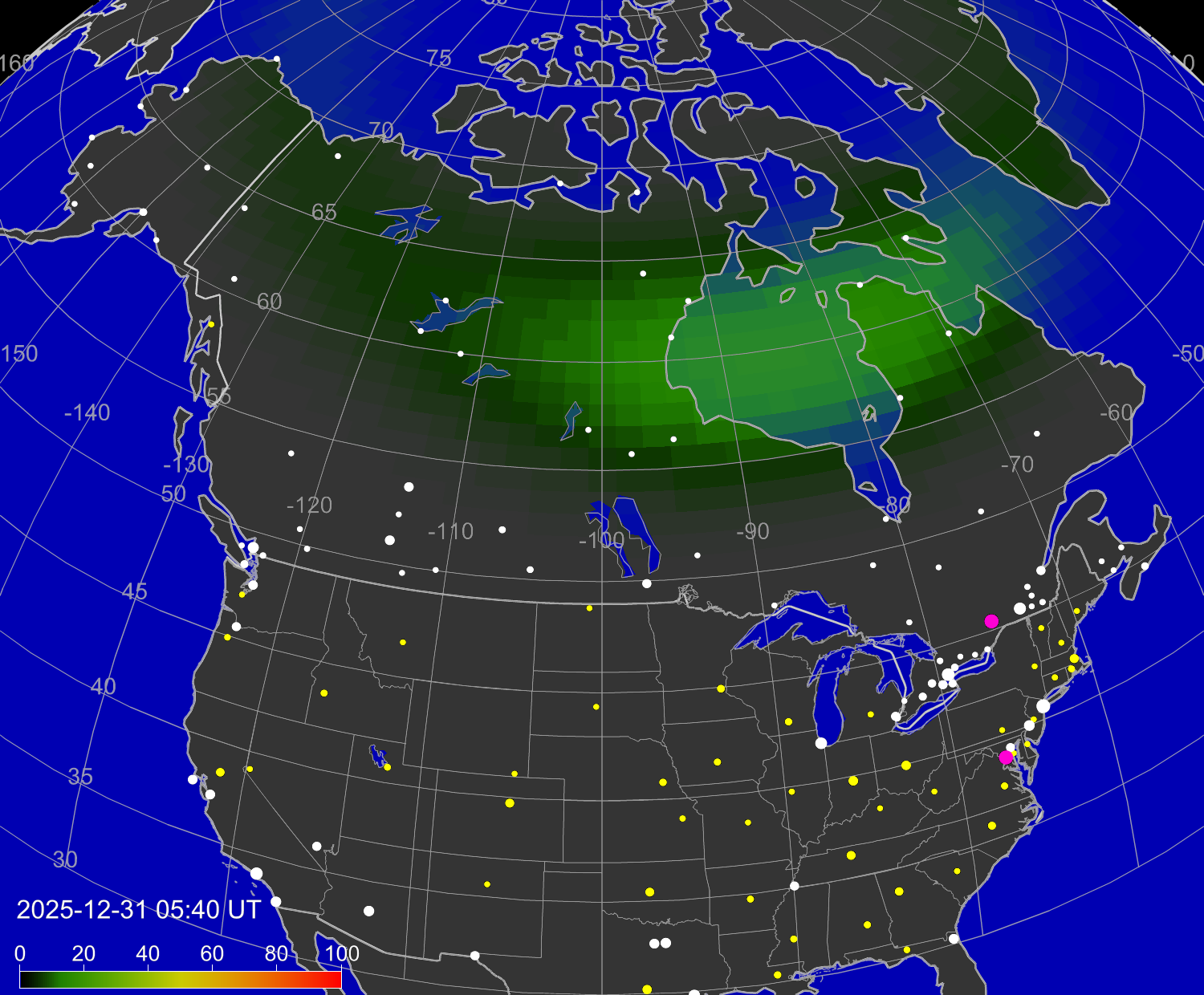 Изменения и часовой прогноз индекса интенсивности полярных сияний с 2025-12-31 по 2026-01-01