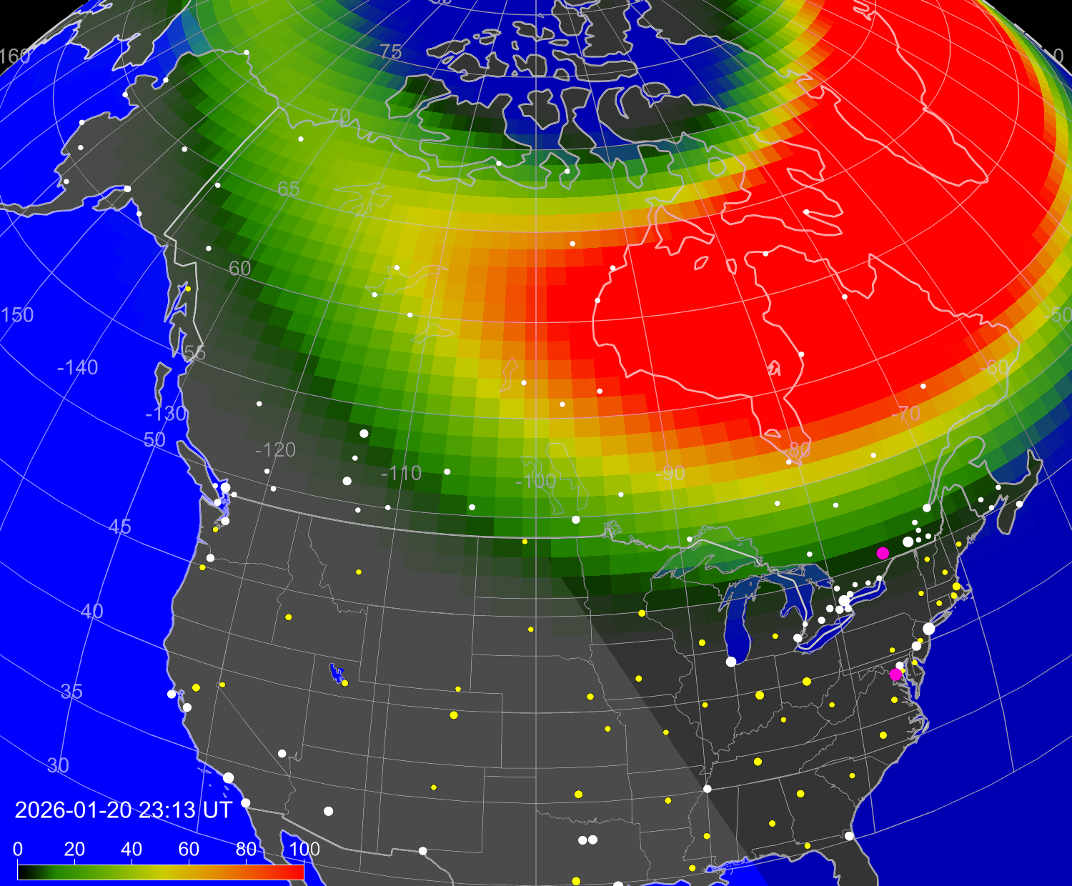 Изменения и часовой прогноз индекса интенсивности полярных сияний с 2026-01-20 по 2026-01-21