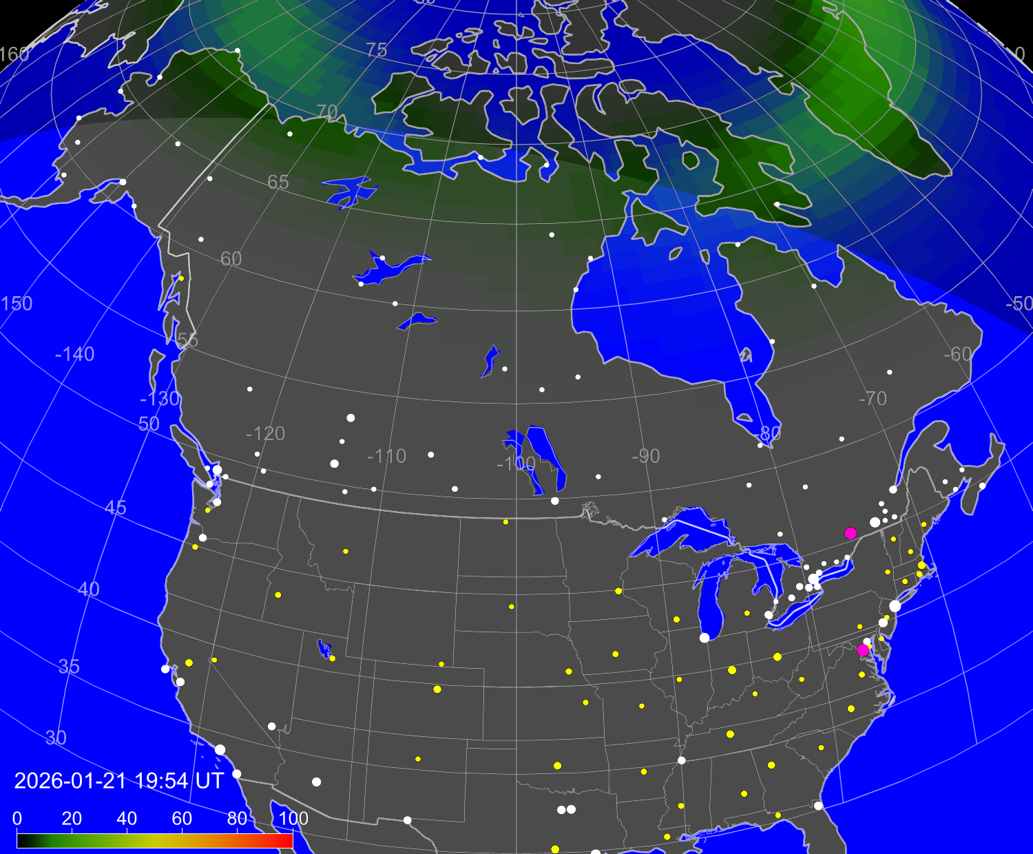 Индекс интенсивности полярных сияний и теоретически возможная широта наблюдений для ночного времени в западном полушарии