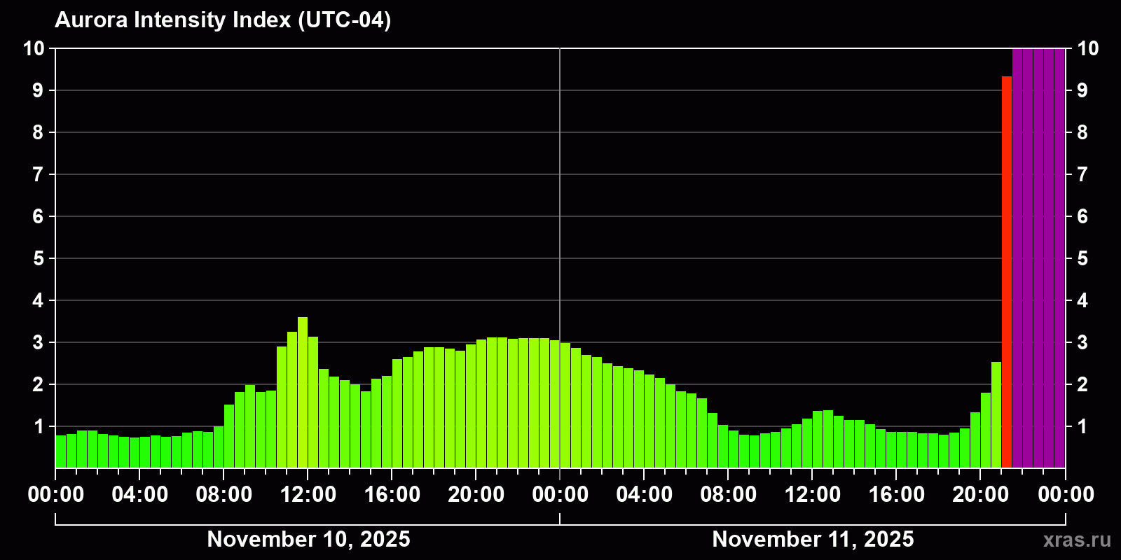 Changes in the auroral intensity index from 2025-11-10 to 2025-11-11 local time