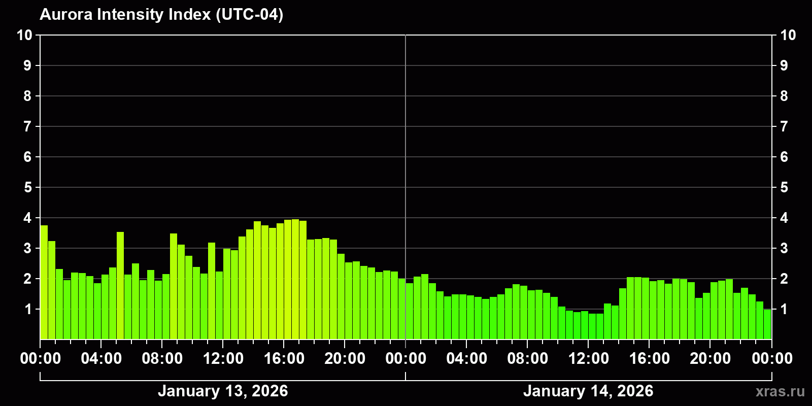 Auroral intensity index and the theoretically possible latitude of observations for nighttime in the Western Hemisphere as of 2026-01-14 23:59 (end of day) local time