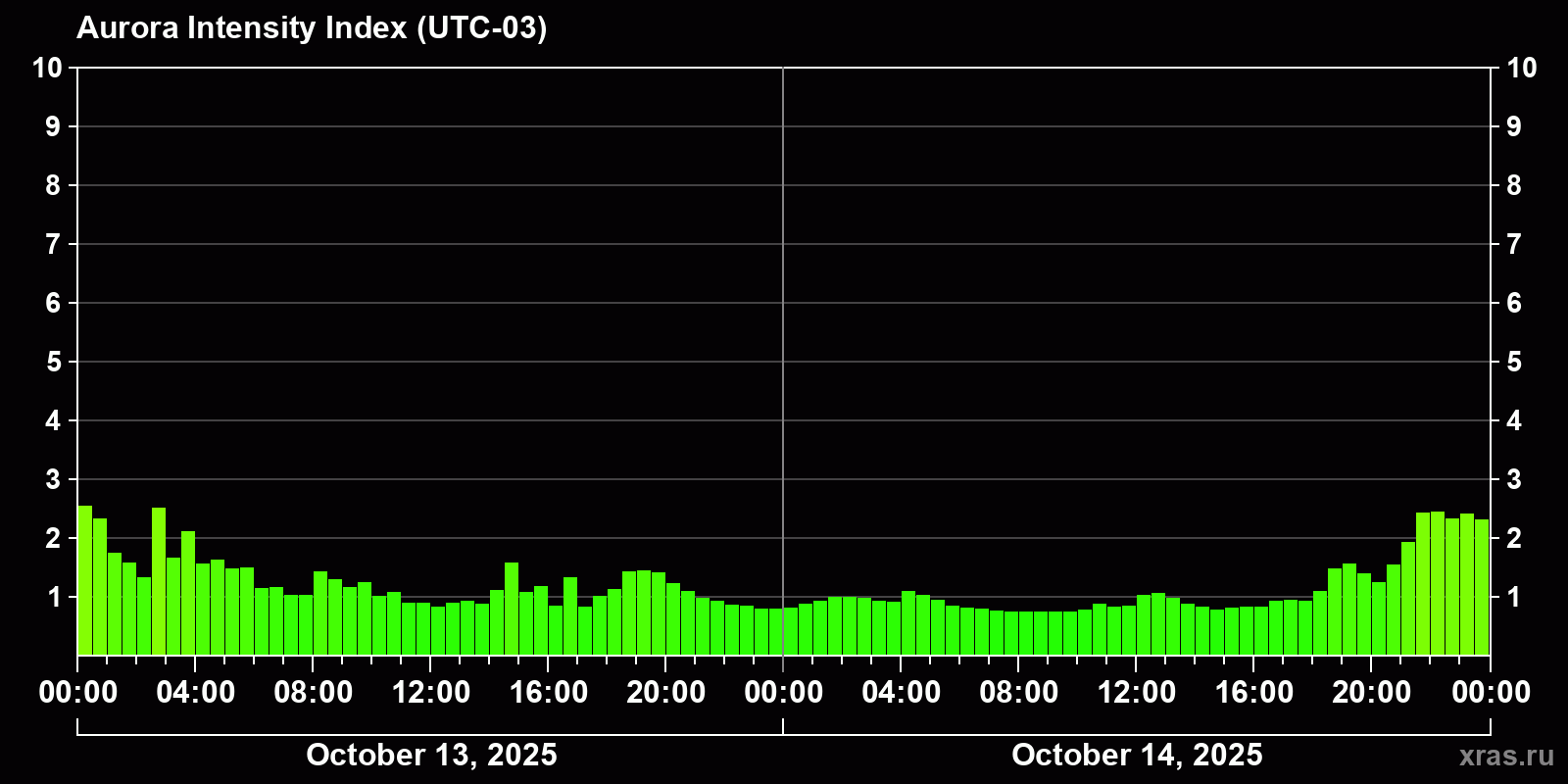 Auroral intensity index and the theoretically possible latitude of observations for nighttime in the Western Hemisphere as of 2025-10-14 23:59 (end of day) local time