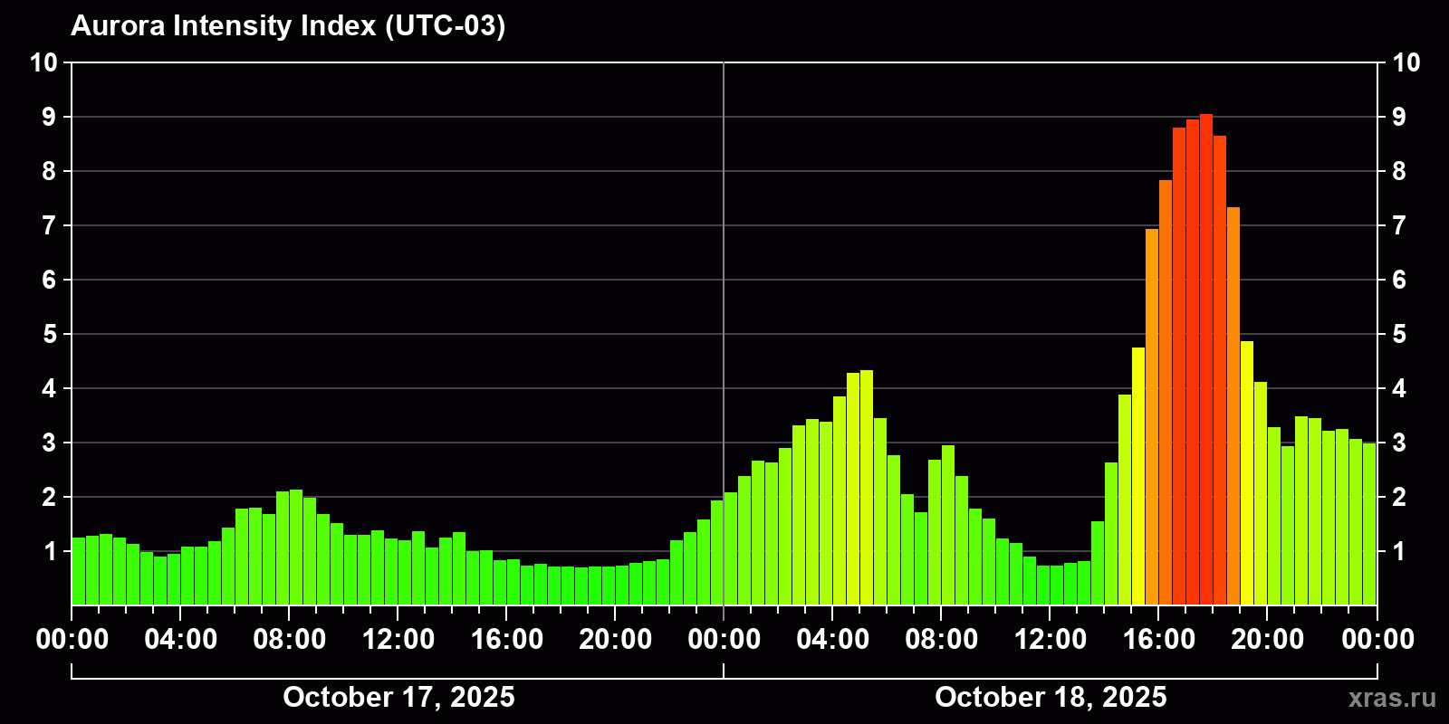 Changes in the auroral intensity index from 2025-10-17 to 2025-10-18 local time