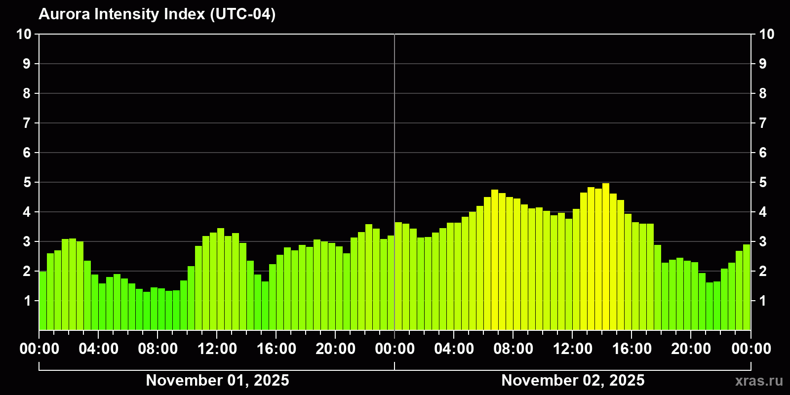 Auroral intensity index and the theoretically possible latitude of observations for nighttime in the Western Hemisphere as of 2025-11-02 23:48 (end of day) local time