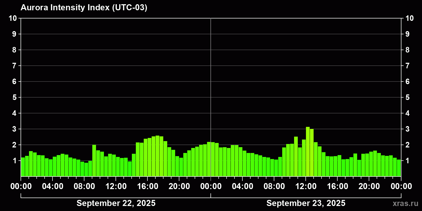 Auroral intensity index and the theoretically possible latitude of observations for nighttime in the Western Hemisphere as of 2025-09-23 23:44 (end of day) local time