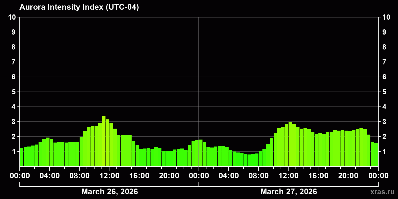 Changes in the auroral intensity index from 2026-03-26 to 2026-03-27 local time