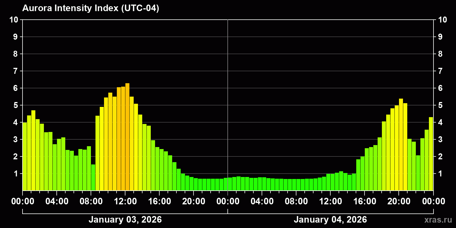 Auroral intensity index and the theoretically possible latitude of observations for nighttime in the Western Hemisphere as of 2026-01-04 23:53 (end of day) local time
