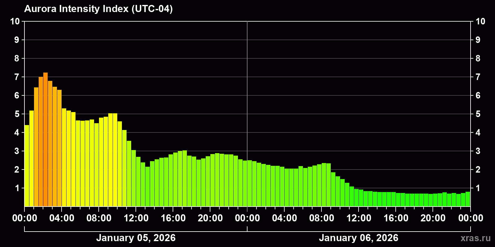 Auroral intensity index and the theoretically possible latitude of observations for nighttime in the Western Hemisphere as of 2026-01-06 23:59 (end of day) local time
