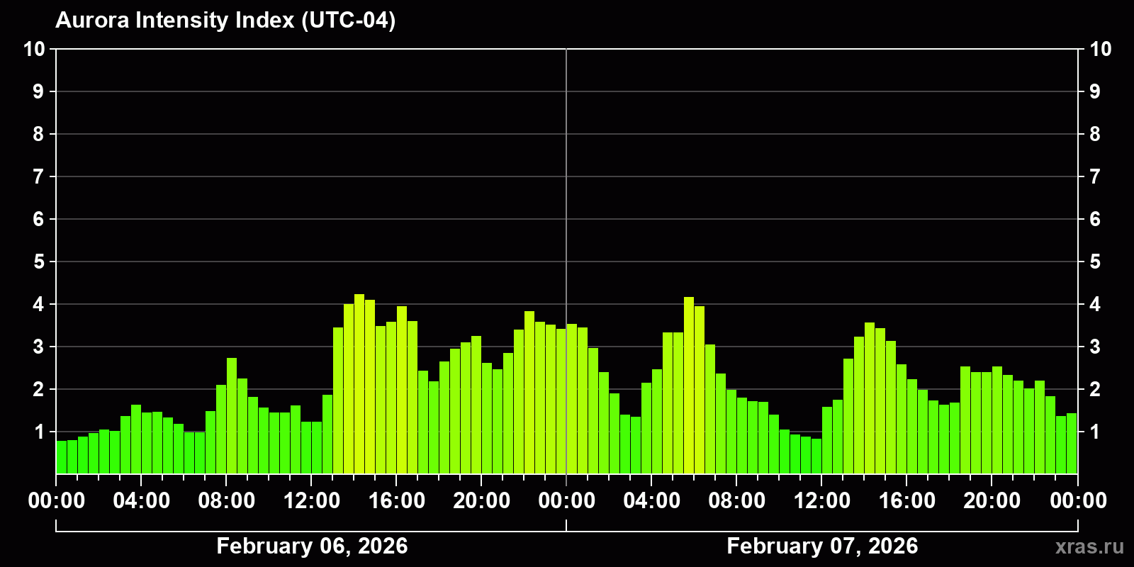 Auroral intensity index and the theoretically possible latitude of observations for nighttime in the Western Hemisphere as of 2026-02-07 23:56 (end of day) local time