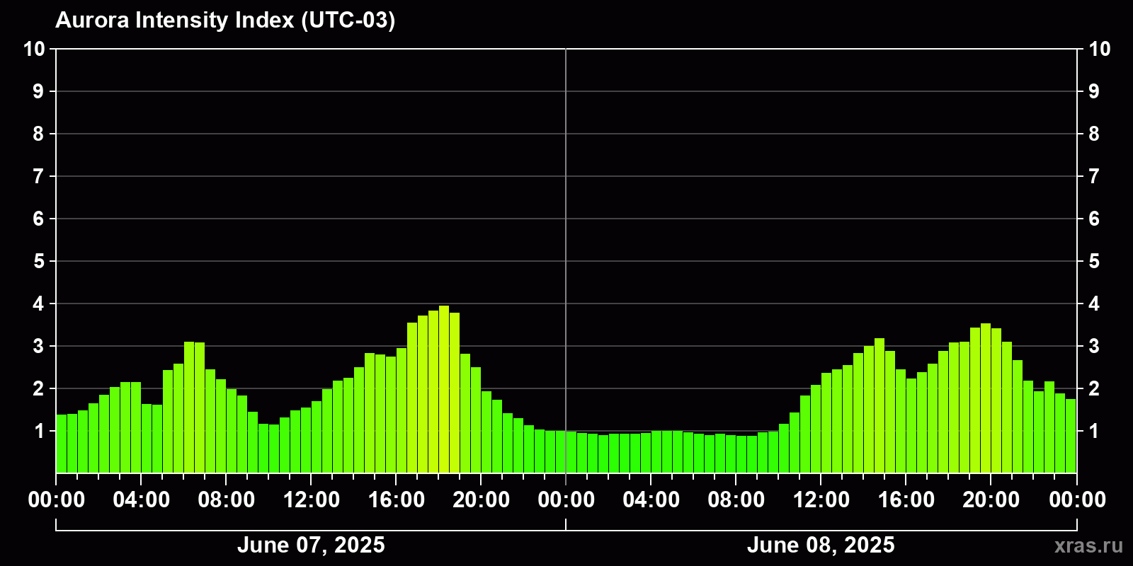 Changes in the auroral intensity index from 2025-06-07 to 2025-06-08 local time