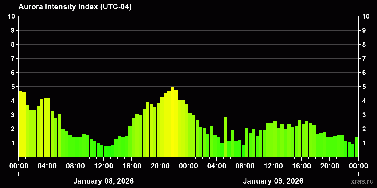 Auroral intensity index and the theoretically possible latitude of observations for nighttime in the Western Hemisphere as of 2026-01-09 23:56 (end of day) local time