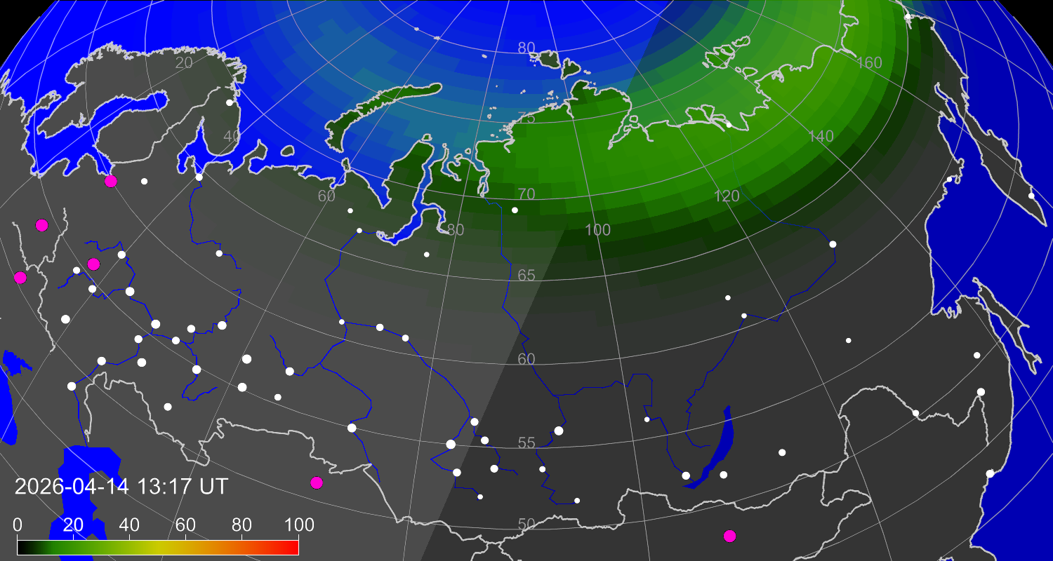 Индекс интенсивности полярных сияний и теоретически возможная широта наблюдений для ночного времени в восточном полушарии