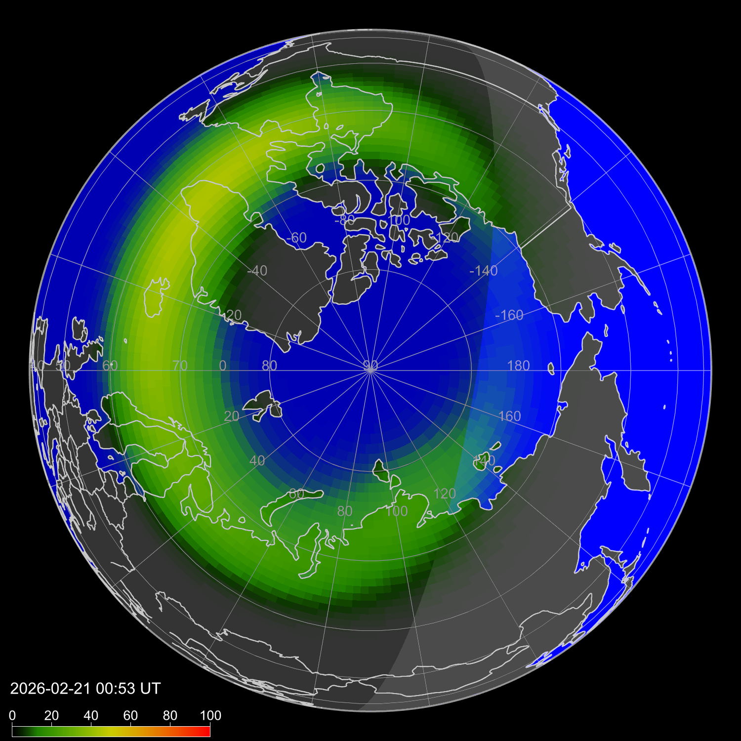 Изменения и часовой прогноз индекса интенсивности полярных сияний с 2026-02-19 по 2026-02-20