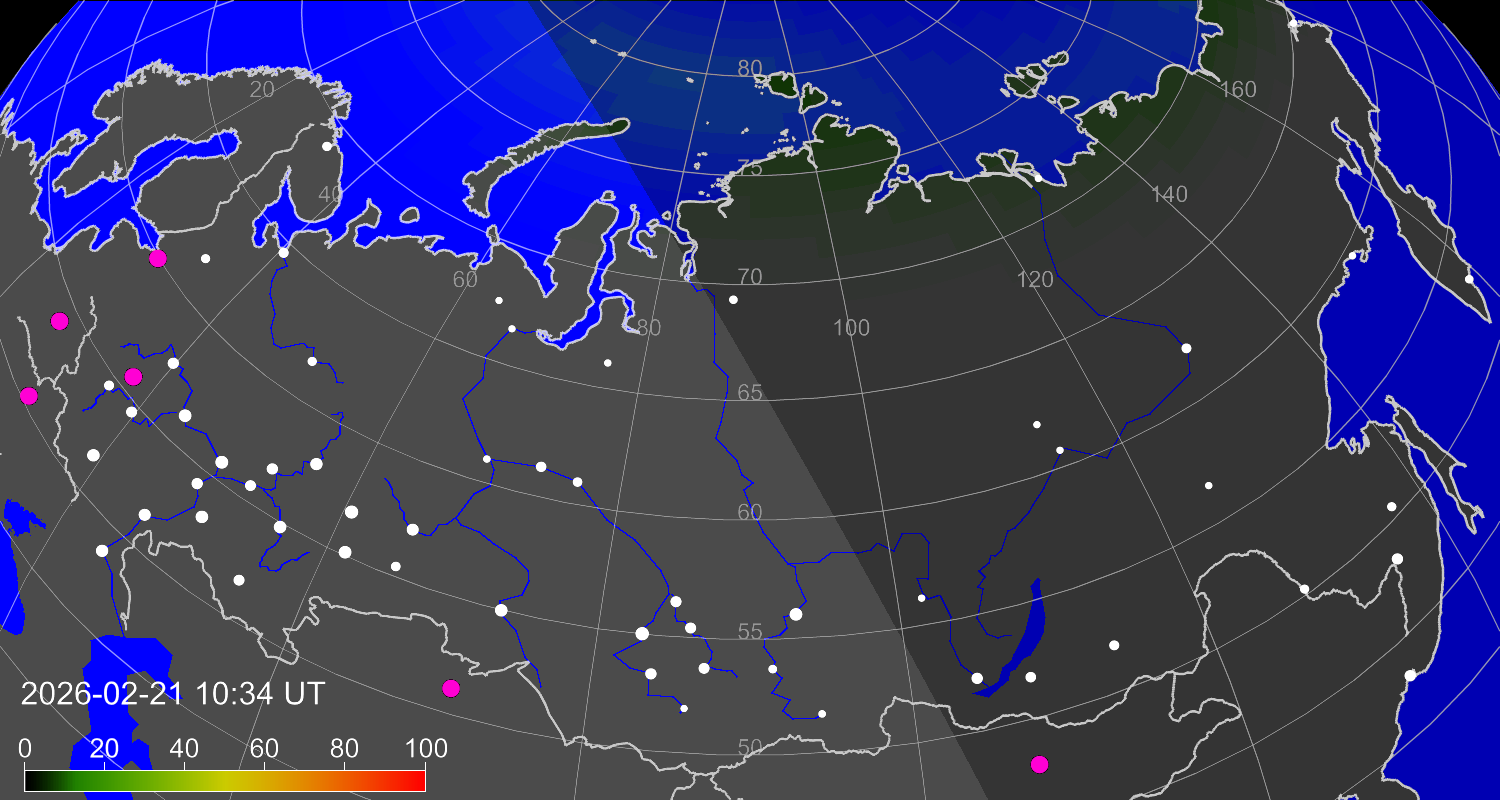 Индекс интенсивности полярных сияний и теоретически возможная широта наблюдений для ночного времени в восточном полушарии