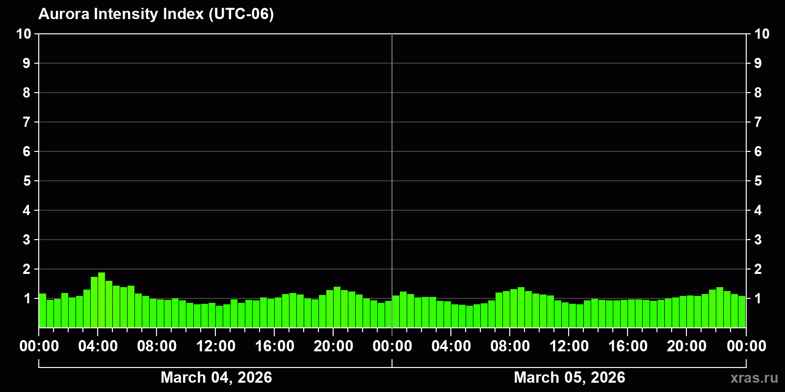 Changes in the auroral intensity index from 2026-03-04 to 2026-03-05 local time