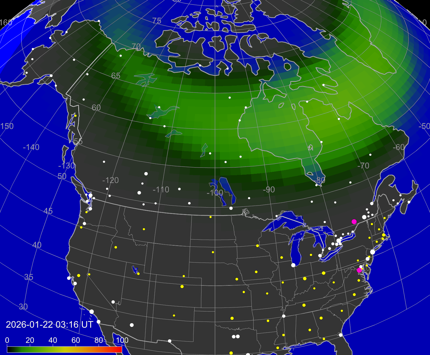 Вероятность полярных сияний в городах Канады