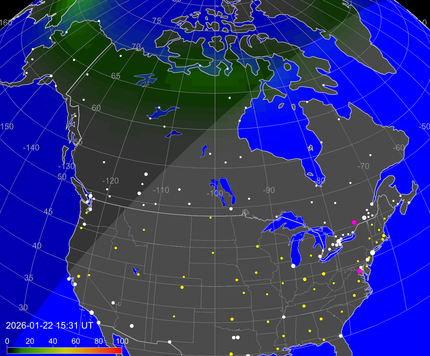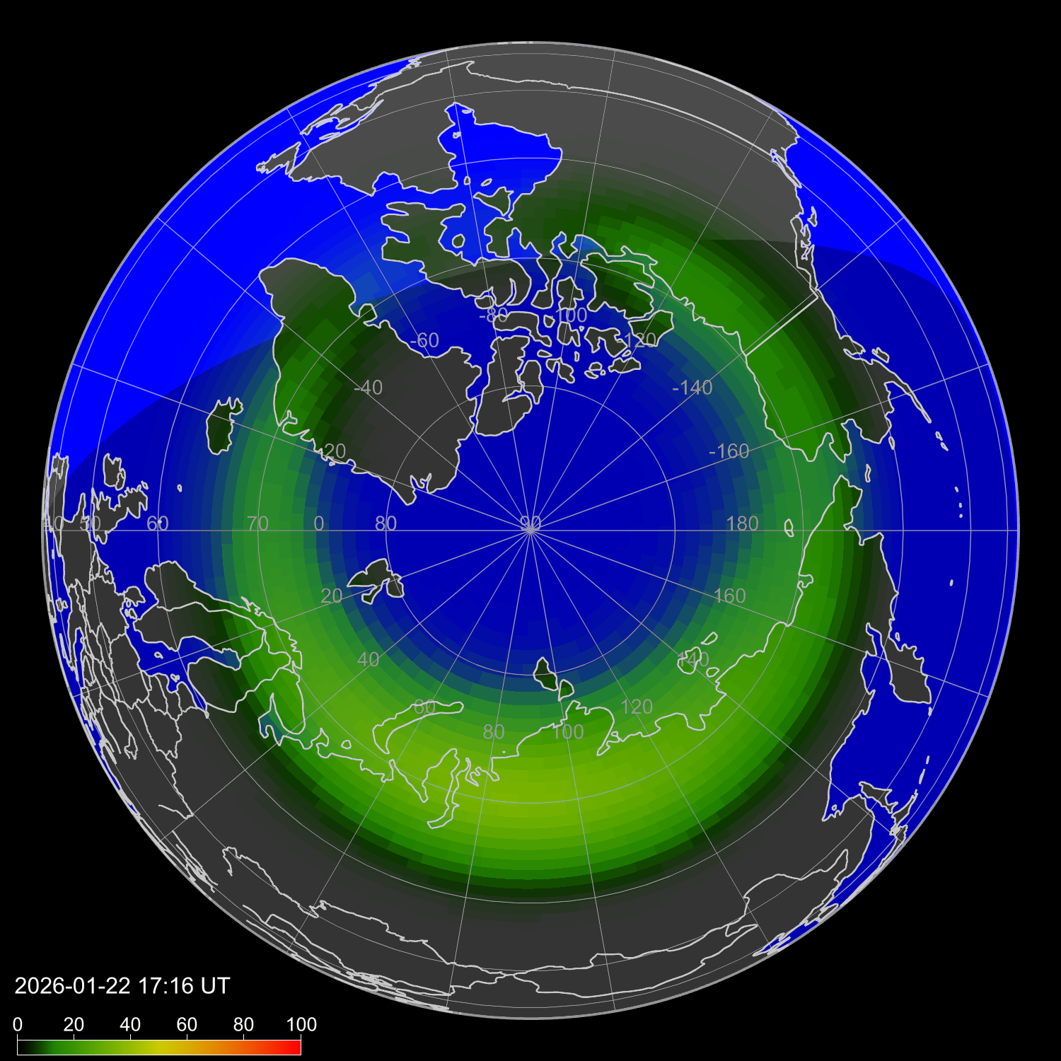 Индекс интенсивности полярных сияний и теоретически возможная широта наблюдений для ночного времени в западном полушарии