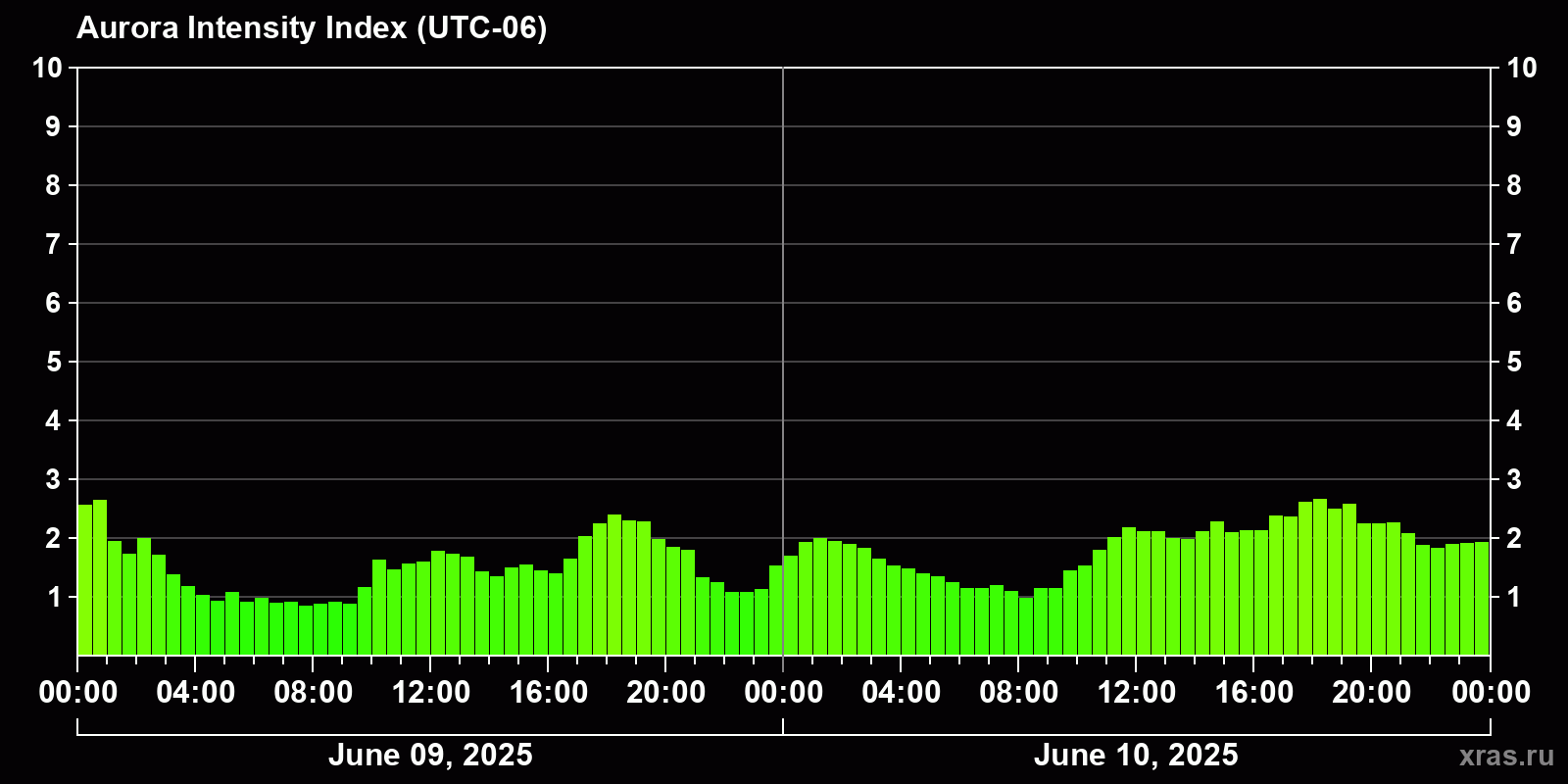 Changes in the auroral intensity index from 2025-06-09 to 2025-06-10 local time
