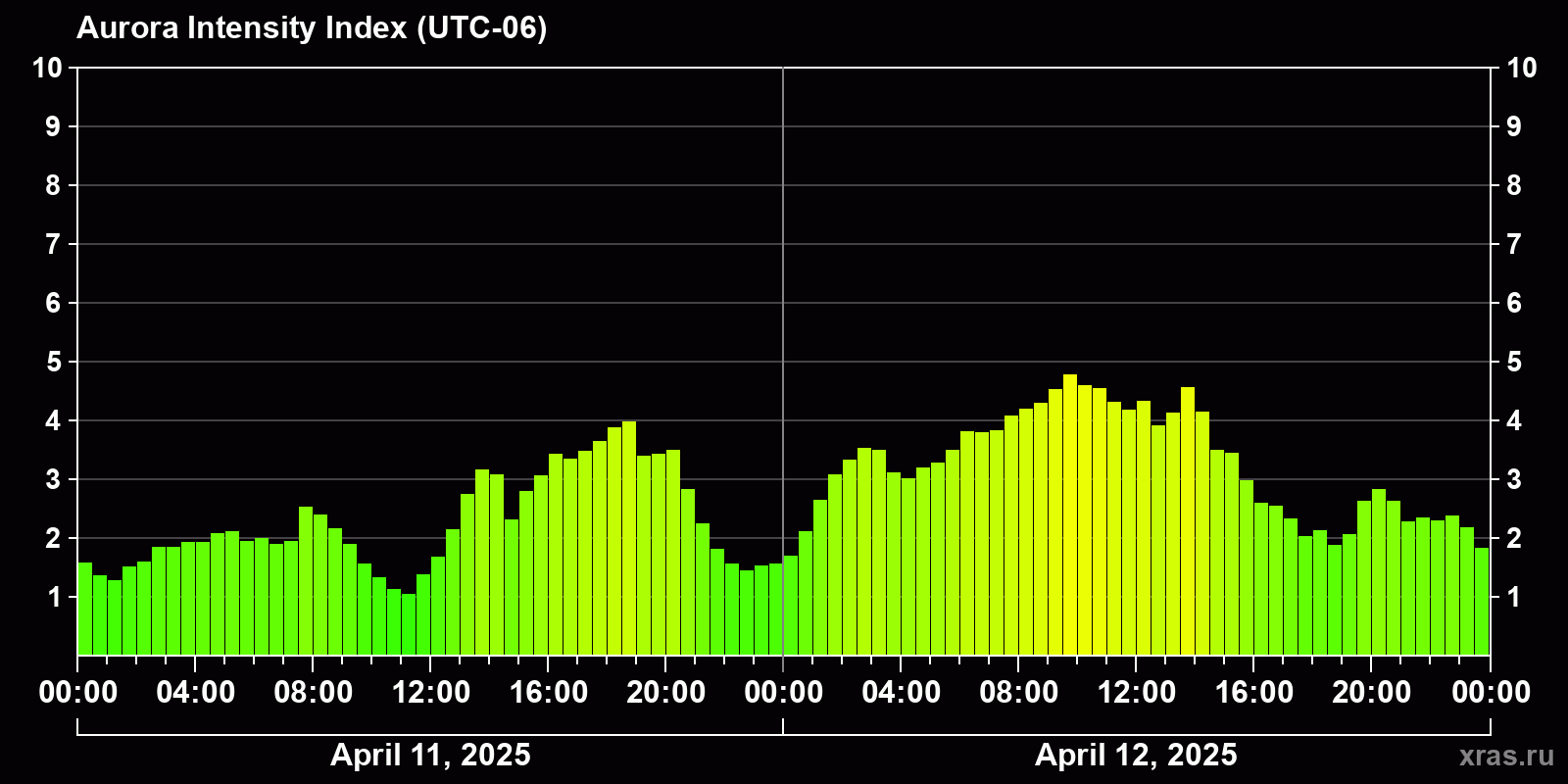 Changes in the auroral intensity index from 2025-04-11 to 2025-04-12 local time