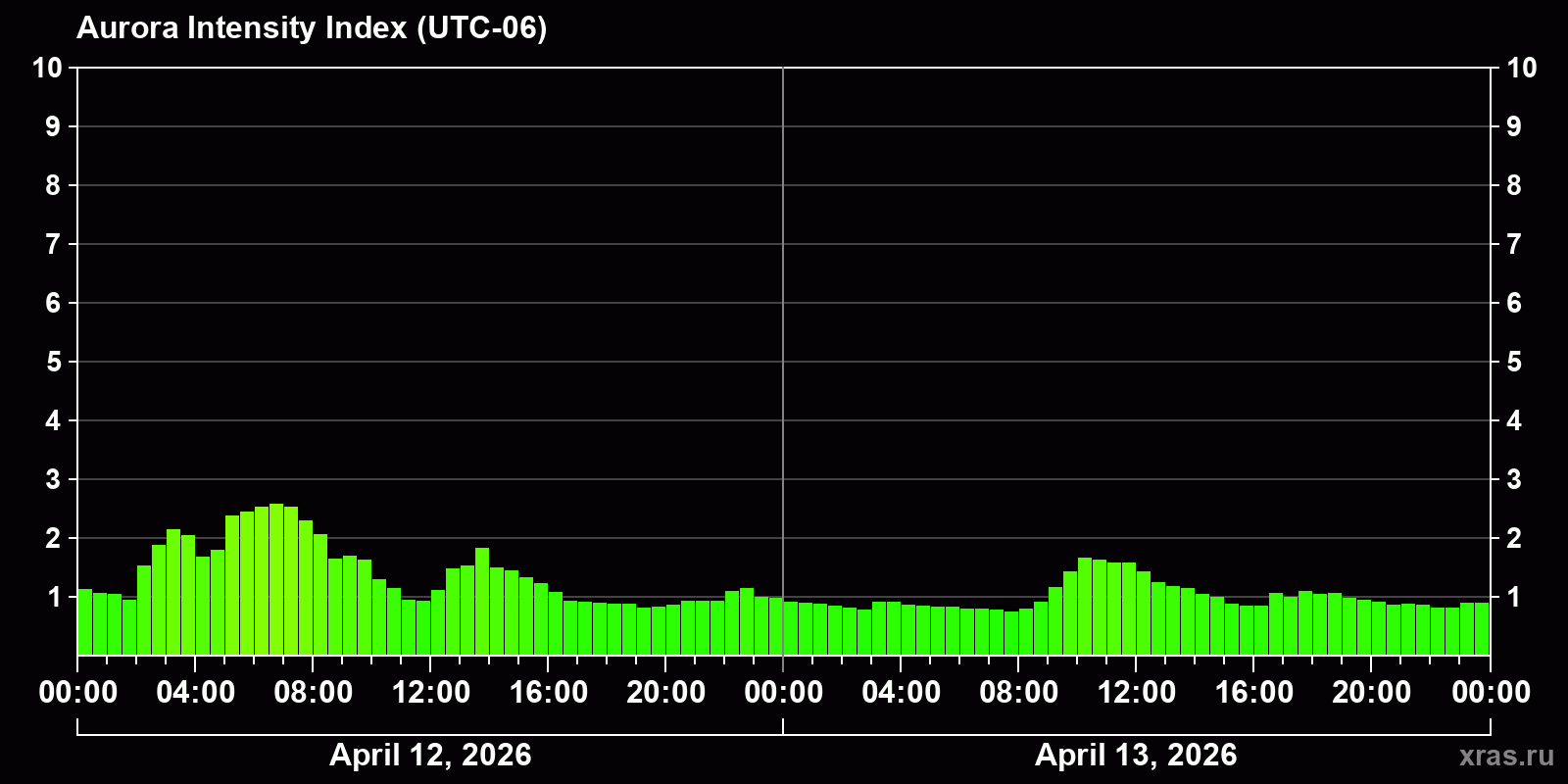 Auroral intensity index and the theoretically possible latitude of observations for nighttime in the Western Hemisphere as of 2026-04-13 23:58 (end of day) local time