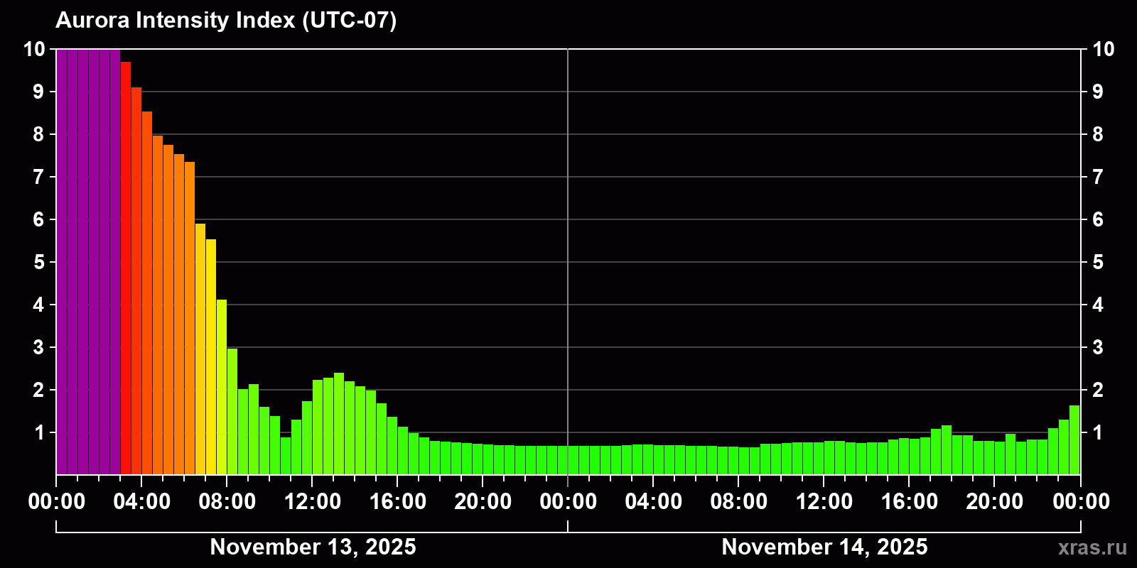 Changes in the auroral intensity index from 2025-11-13 to 2025-11-14 local time