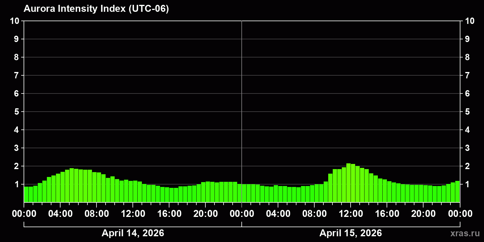 Changes in the auroral intensity index from 2026-04-14 to 2026-04-15 local time