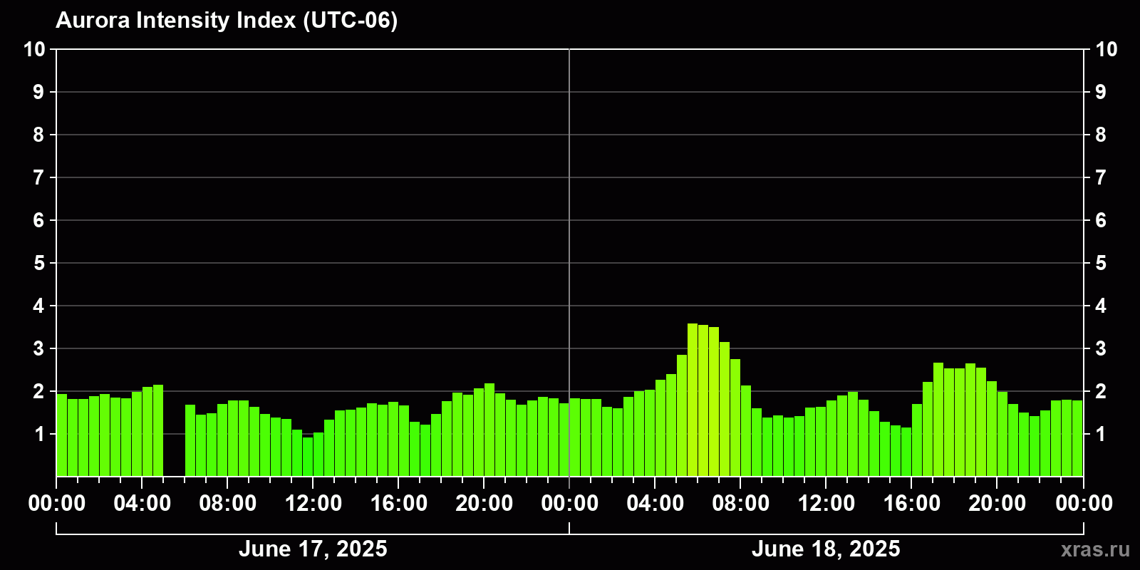 Auroral intensity index and the theoretically possible latitude of observations for nighttime in the Western Hemisphere as of 2025-06-18 23:56 (end of day) local time