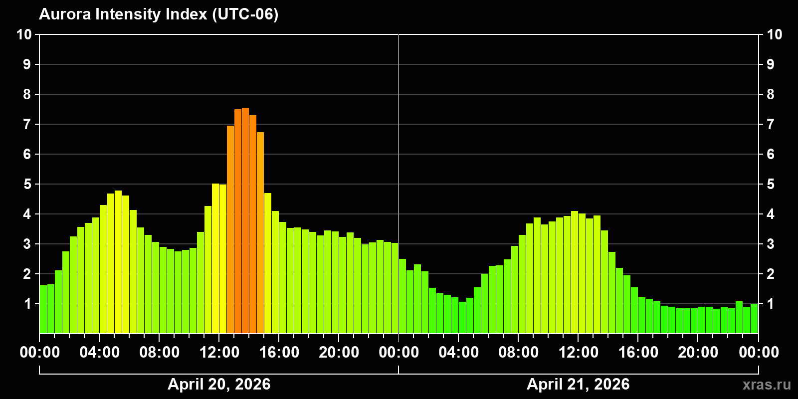 Changes in the auroral intensity index from 2026-04-20 to 2026-04-21 local time