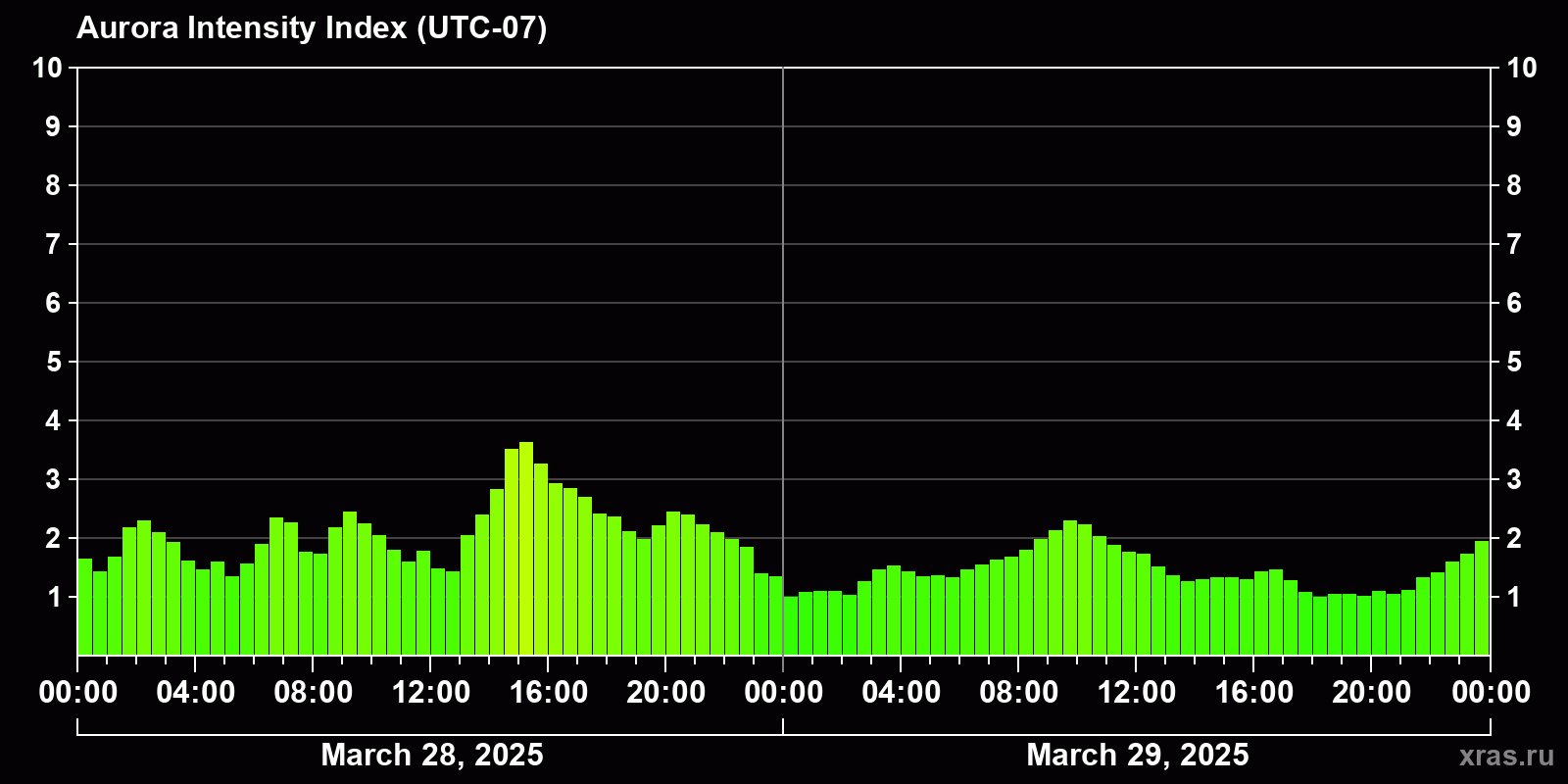 Changes in the auroral intensity index from 2025-03-28 to 2025-03-29 local time