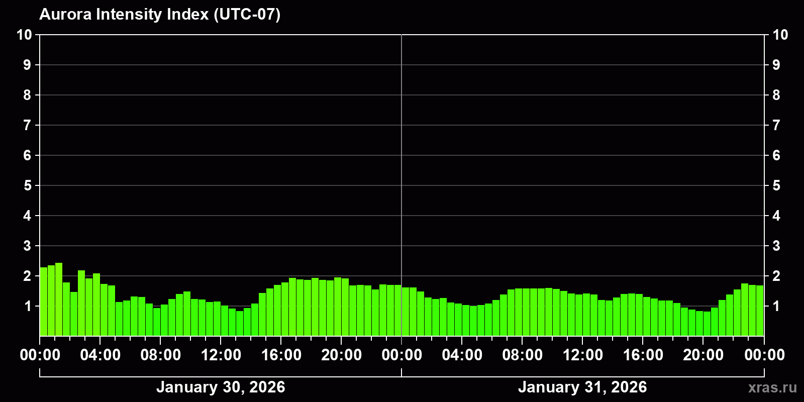 Changes in the auroral intensity index from 2026-01-30 to 2026-01-31 local time