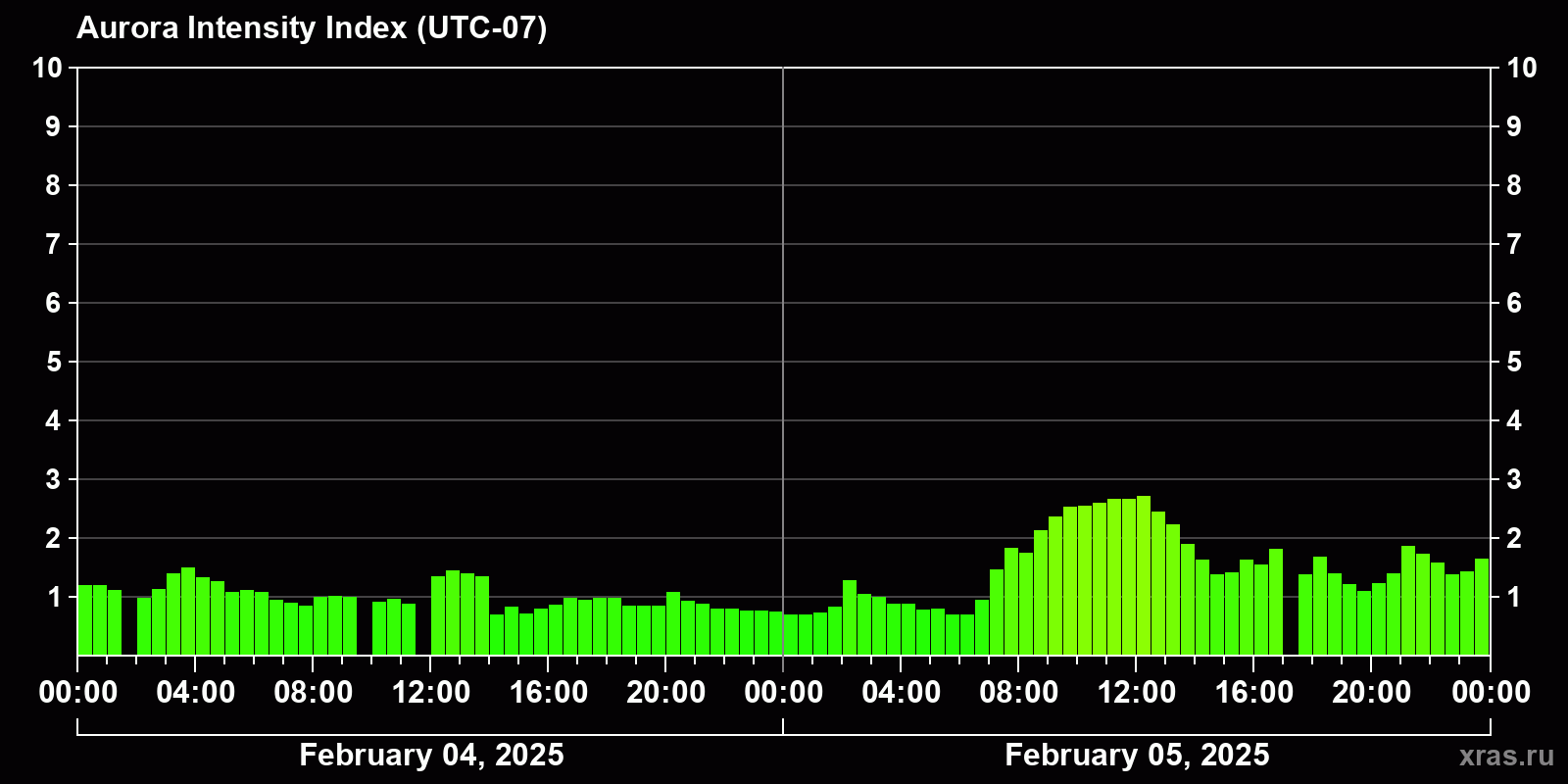 Changes in the auroral intensity index from 2025-02-04 to 2025-02-05 local time